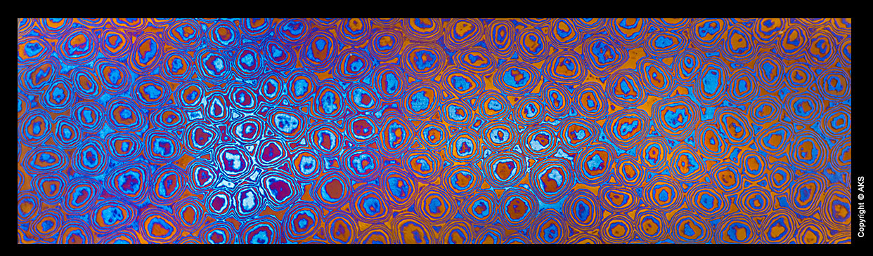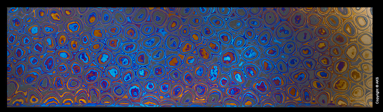 The knife below was made in 2017 by Jon Walker. The blade is 8670 full hard (not tempered). We wanted to test the untempered toughness of the alloy. The guard is heat colored zirconium. The handle is blue denim laminate with orange G10 framing the tang. A copper rod was peened to resemble a rivet. The knife is used every day at a packaging station.