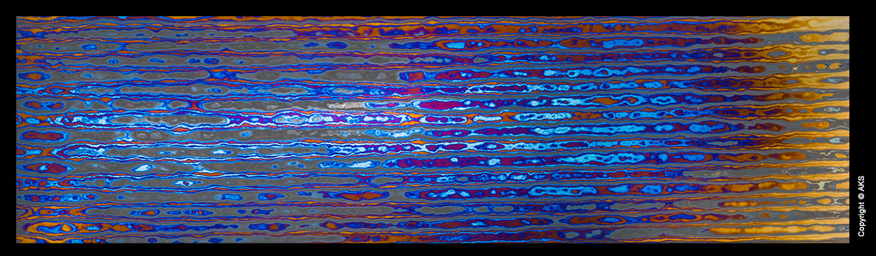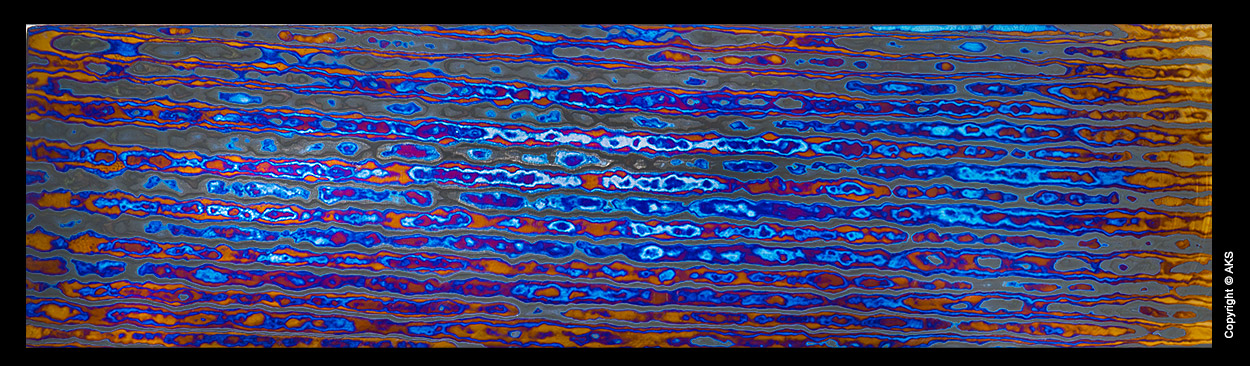 The knife below was made in 2017 by Jon Walker. The blade is 8670 full hard (not tempered). We wanted to test the untempered toughness of the alloy. The guard is heat colored zirconium. The handle is blue denim laminate with orange G10 framing the tang. A copper rod was peened to resemble a rivet. The knife is used every day at a packaging station.