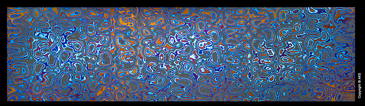 The knife below was made in 2017 by Jon Walker. The blade is 8670 full hard (not tempered). We wanted to test the untempered toughness of the alloy. The guard is heat colored zirconium. The handle is blue denim laminate with orange G10 framing the tang. A copper rod was peened to resemble a rivet. The knife is used every day at a packaging station.