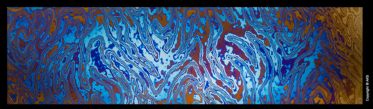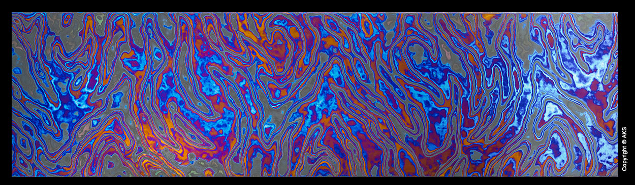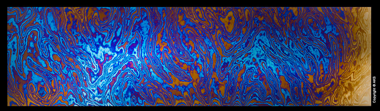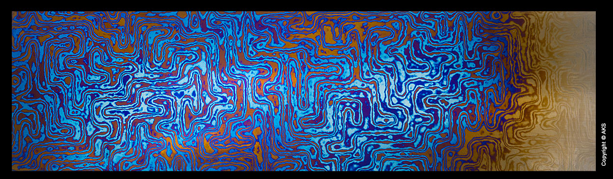 The knife below was made in 2017 by Jon Walker. The blade is 8670 full hard (not tempered). We wanted to test the untempered toughness of the alloy. The guard is heat colored zirconium. The handle is blue denim laminate with orange G10 framing the tang. A copper rod was peened to resemble a rivet. The knife is used every day at a packaging station.