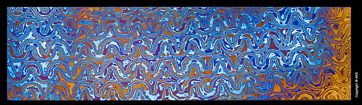 The knife below was made in 2017 by Jon Walker. The blade is 8670 full hard (not tempered). We wanted to test the untempered toughness of the alloy. The guard is heat colored zirconium. The handle is blue denim laminate with orange G10 framing the tang. A copper rod was peened to resemble a rivet. The knife is used every day at a packaging station.