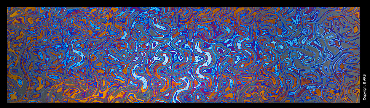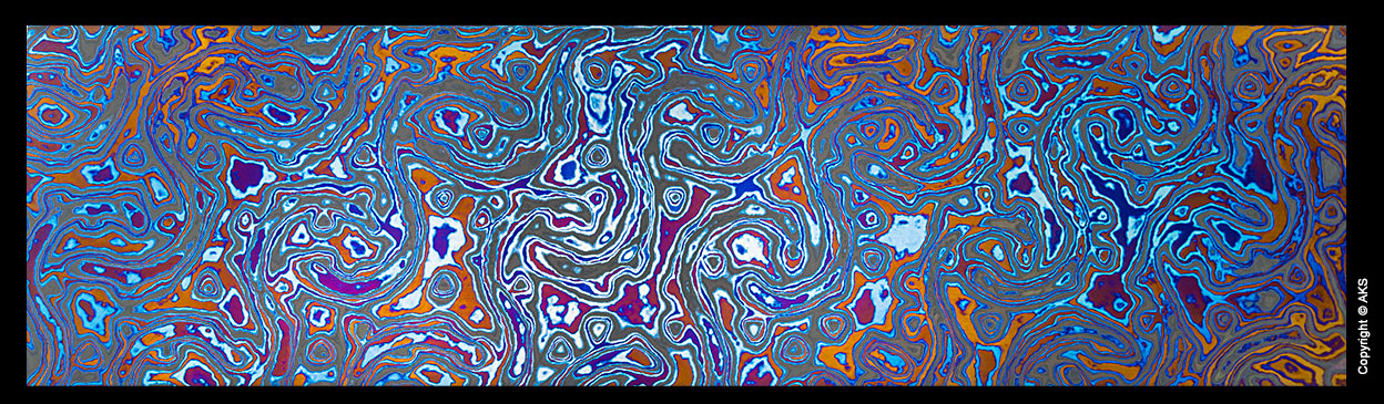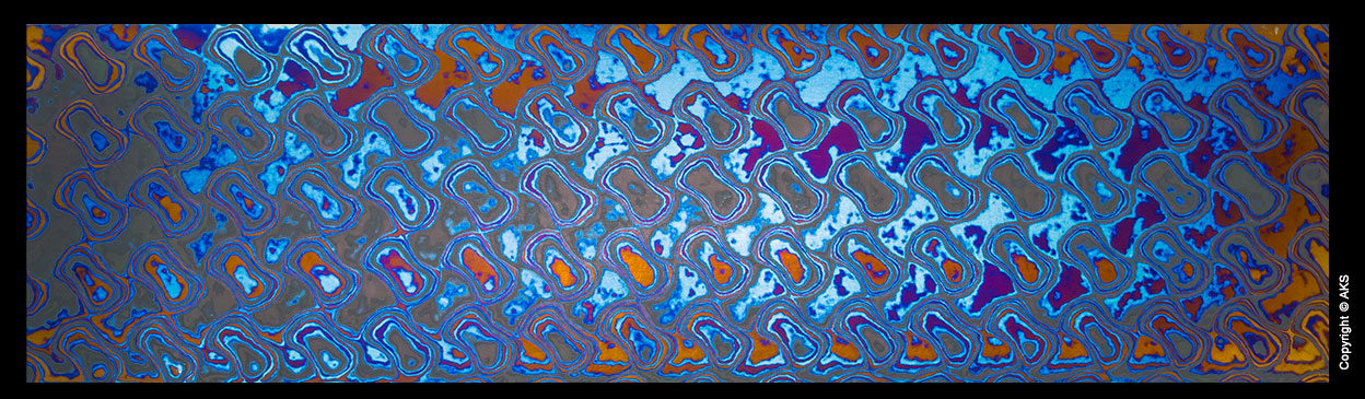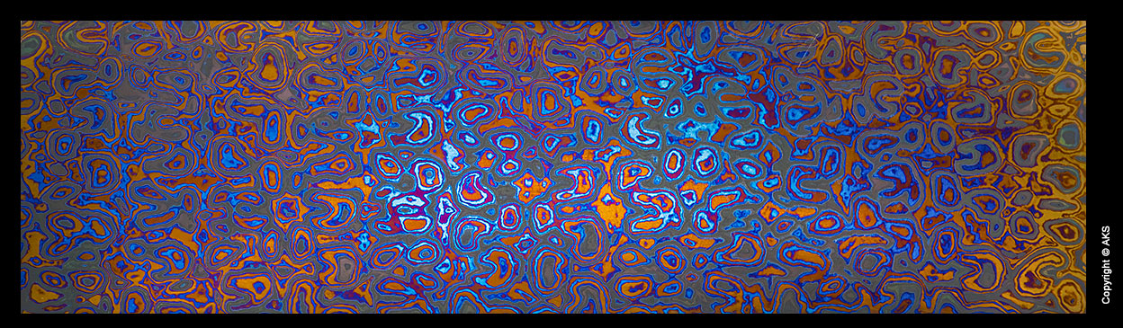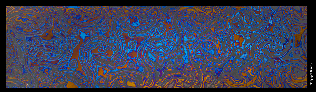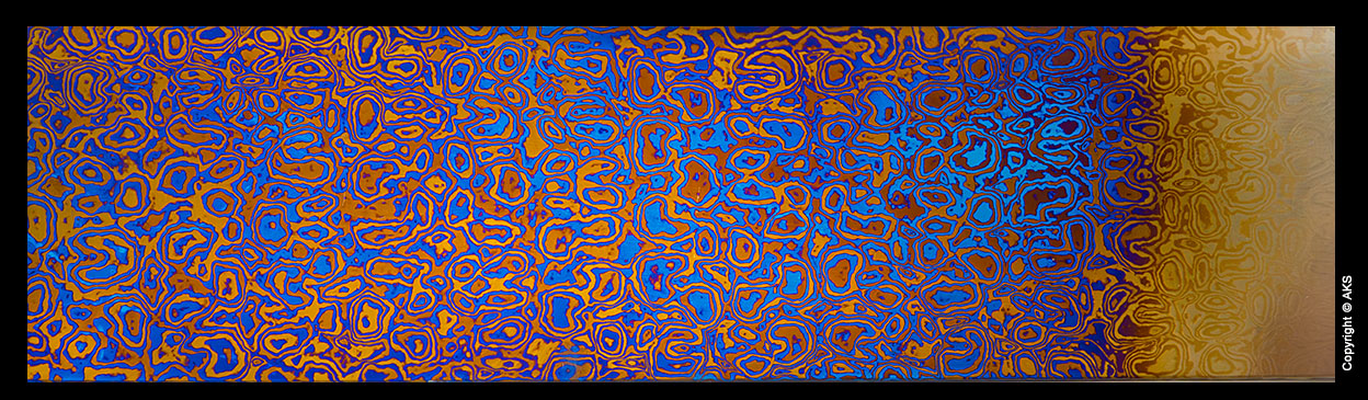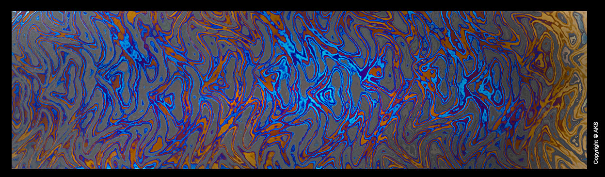 The knife below was made in 2017 by Jon Walker. The blade is 8670 full hard (not tempered). We wanted to test the untempered toughness of the alloy. The guard is heat colored zirconium. The handle is blue denim laminate with orange G10 framing the tang. A copper rod was peened to resemble a rivet. The knife is used every day at a packaging station.
