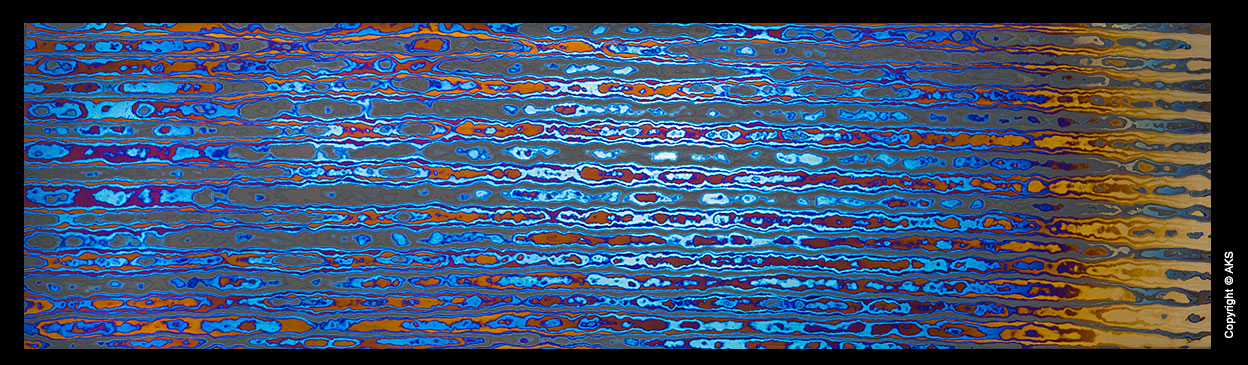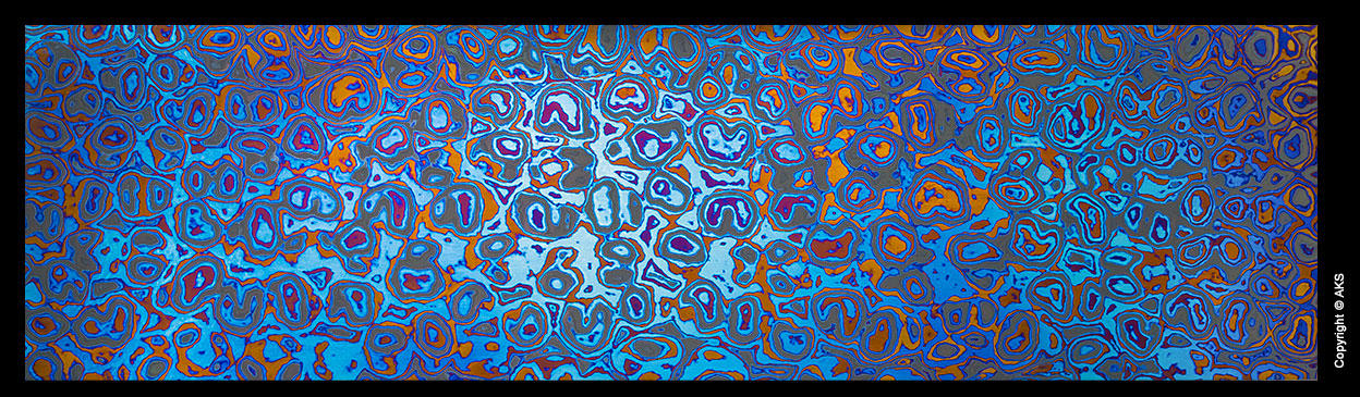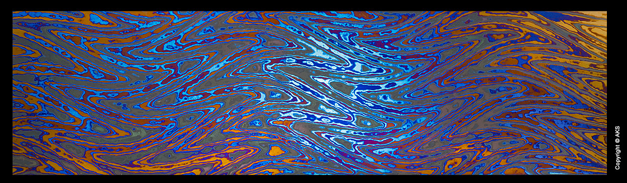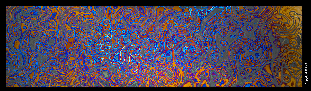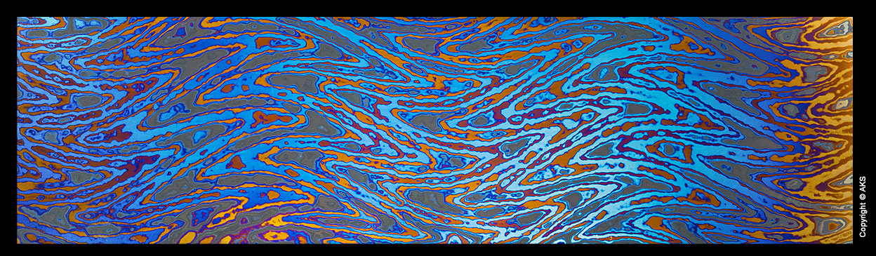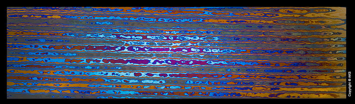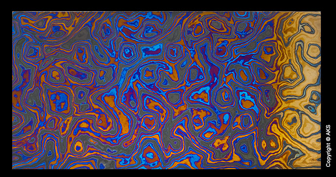 The knife below was made in 2017 by Jon Walker. The blade is 8670 full hard (not tempered). We wanted to test the untempered toughness of the alloy. The guard is heat colored zirconium. The handle is blue denim laminate with orange G10 framing the tang. A copper rod was peened to resemble a rivet. The knife is used every day at a packaging station.