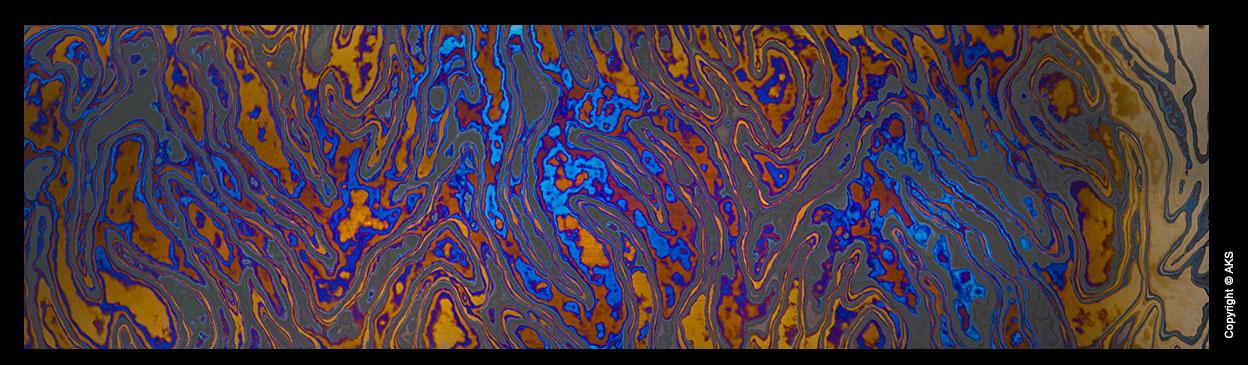 The knife below was made in 2017 by Jon Walker. The blade is 8670 full hard (not tempered). We wanted to test the untempered toughness of the alloy. The guard is heat colored zirconium. The handle is blue denim laminate with orange G10 framing the tang. A copper rod was peened to resemble a rivet. The knife is used every day at a packaging station.