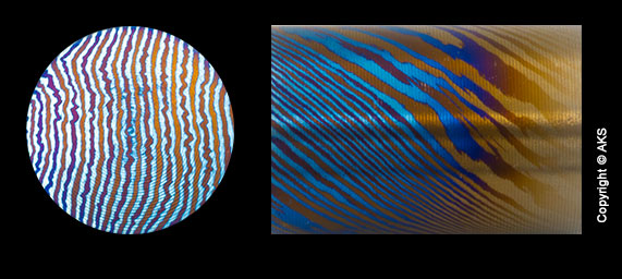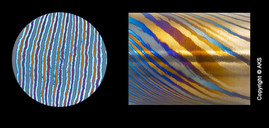 Timascus can be colored by heat and/or anodizing. The current mix of alloys seems to show more contrast through the use of heat than anodizing. Although anodizing does show contrast in the higher voltage ranges. A highly polished finish will produce the brightest colors where as a satin finish can produce the most visually contrasting appearance. All of the current titanium coloring techniques can be applied to Timascus.Working Characteristics