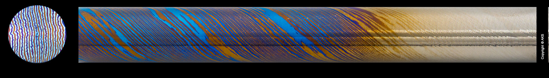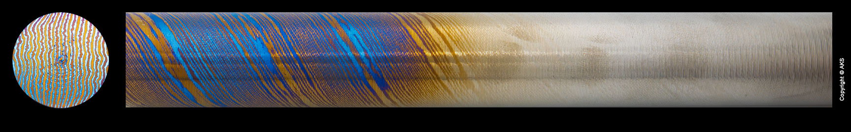 Some mosaic patterns like Racing Stripe & Pin Stripe look simple. It is just layers laid up and welded together. The hard part is keeping the layers straight. It takes extreme control on the forging press to weld the layers together without distortion. We call this “Precision Forging”. The layers in Precision Forged billets should not look like they were drawn by a 3 year old with a Sharpie pen.